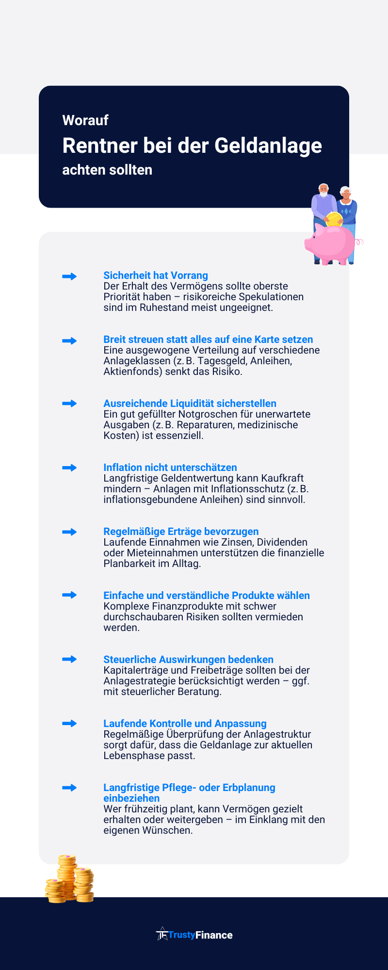 Wichtig ist, dass die Geldanlage auf die individuellen Bedürfnisse und die Lebenssituation im Ruhestand abgestimmt ist. Rentner sollten dabei auch mögliche Inflationsrisiken und steuerliche Aspekte berücksichtigen, um ihre finanzielle Situation langfristig zu sichern.
