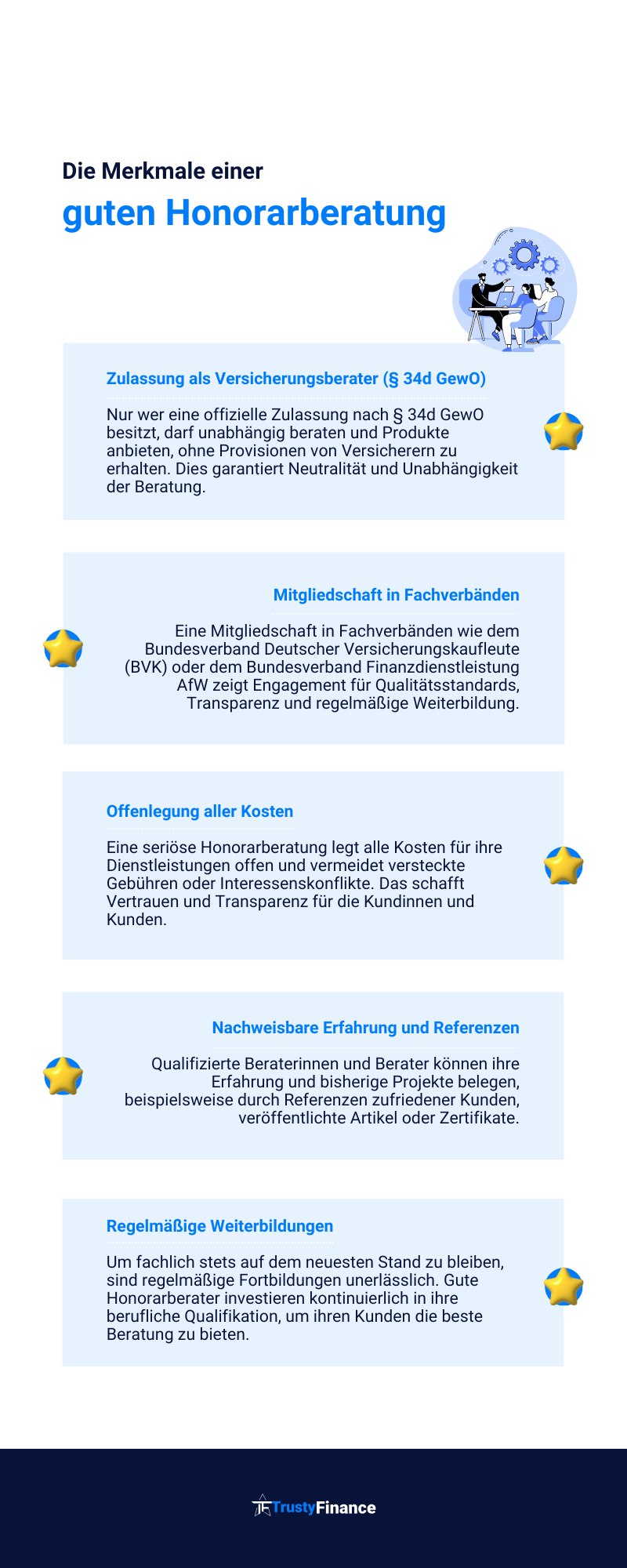 Die Entscheidung für einen Honorarberater für Versicherungen will gut überlegt sein. Damit Sie die richtige Wahl treffen, sollten Sie auf einige zentrale Punkte achten, die Ihnen helfen, die Qualität und Unabhängigkeit des Beraters einzuschätzen.