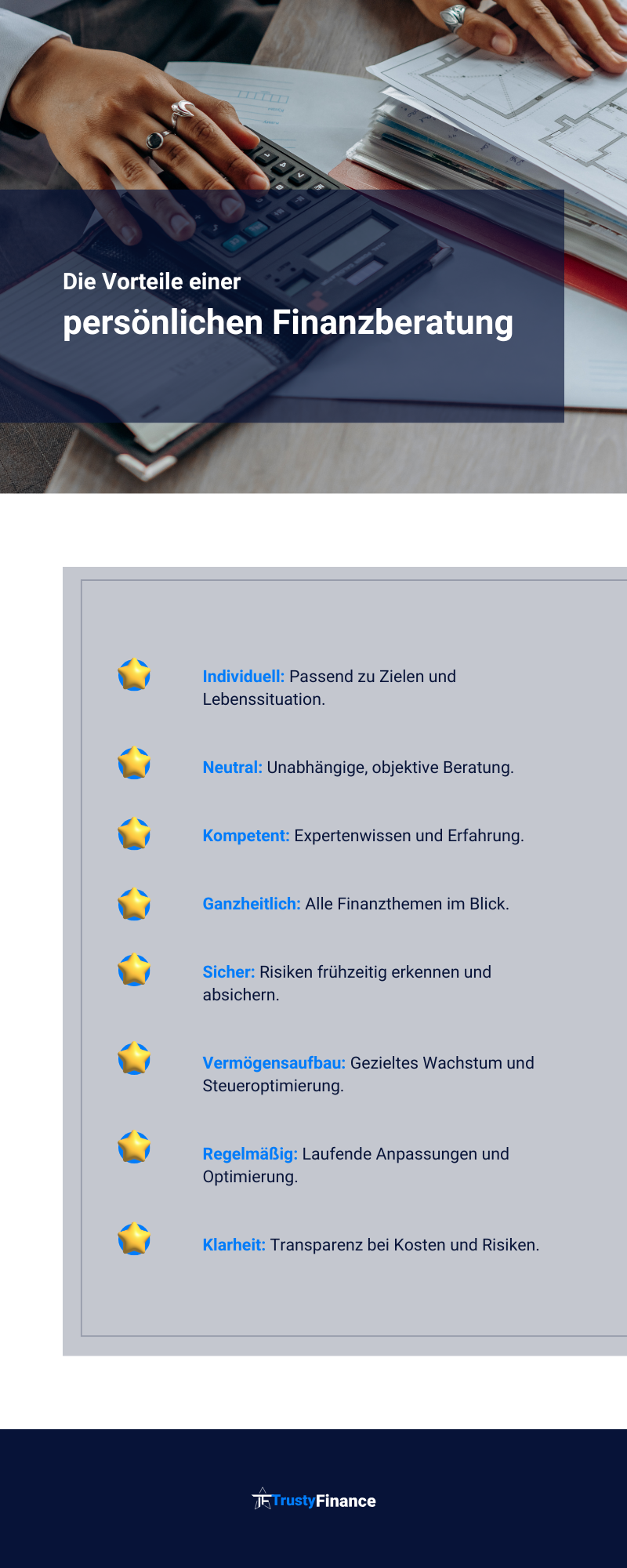 Gerade in wirtschaftlich turbulenten Zeiten ist eine maßgeschneiderte Finanzstrategie unerlässlich. Bei Trustyfinance steht Ihre individuelle Lebenssituation im Mittelpunkt: Unsere Berater analysieren gemeinsam mit Ihnen Ihre Vermögensverhältnisse, Ihre Ziele und Ihre Risikobereitschaft – und entwickeln daraus ein Konzept, das langfristig trägt. Wir setzen auf Transparenz, Qualität und nachvollziehbare Empfehlungen, die sich an bewährten Prinzipien der krisensicheren Geldanlage orientieren. Ob Sachwerte, Fonds oder Liquiditätsplanung – bei Trustyfinance erhalten Sie eine Beratung auf Augenhöhe, die nicht kurzfristige Rendite, sondern langfristige Stabilität ins Zentrum stellt.