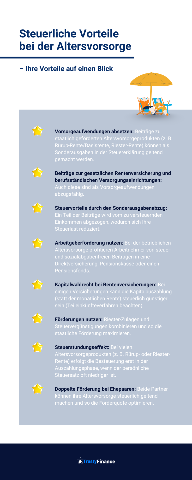 Wer frühzeitig mit der Planung aller 3 Säulen der Altersvorsorge beginnt, flexibel auf Veränderungen reagiert und staatliche Förderungen nutzt, legt den Grundstein für eine selbstbestimmte und sorgenfreie Zukunft. Ein ausgewogener Mix aller drei Säulen schützt vor Versorgungslücken und sichert langfristig den eigenen Lebensstandard. So bleiben Sie auch im Alter finanziell unabhängig und können Ihren Ruhestand in vollen Zügen genießen.