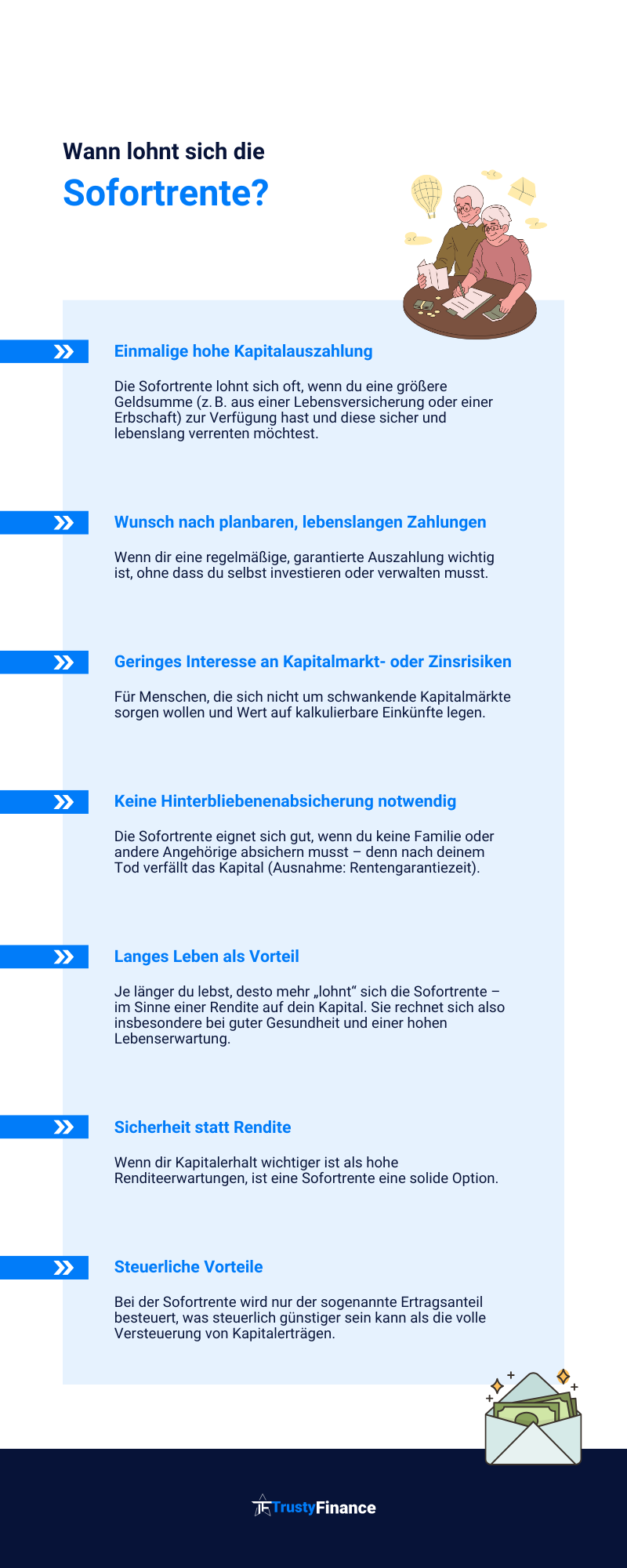 Auch sicherheitsorientierte Anleger, die auf eine verlässliche Rentenzahlung ohne große Schwankungen setzen, schätzen die Sofortrente. Sie eignet sich zudem für Menschen, die ihre Hinterbliebenen absichern möchten, da viele Tarife eine Rentengarantiezeit beinhalten.