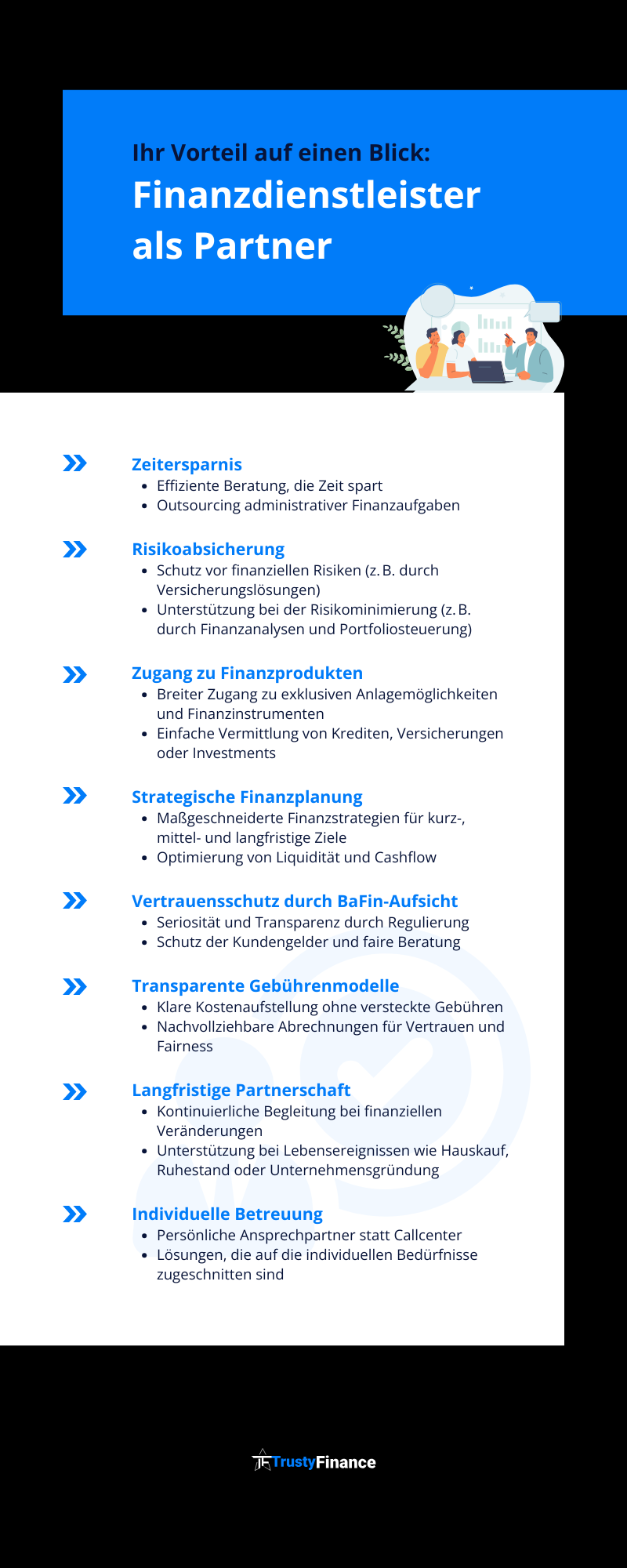 Dank der Fachkenntnisse und der umfassenden Marktkenntnis in dem Berufsbild schaffen Finanzdienstleister Vertrauen und reduzieren für Verbraucher und Unternehmen den Aufwand bei finanziellen Entscheidungen. Ihre Arbeit fördert eine nachhaltige und sichere Finanzplanung und trägt damit wesentlich zur wirtschaftlichen Stabilität bei.